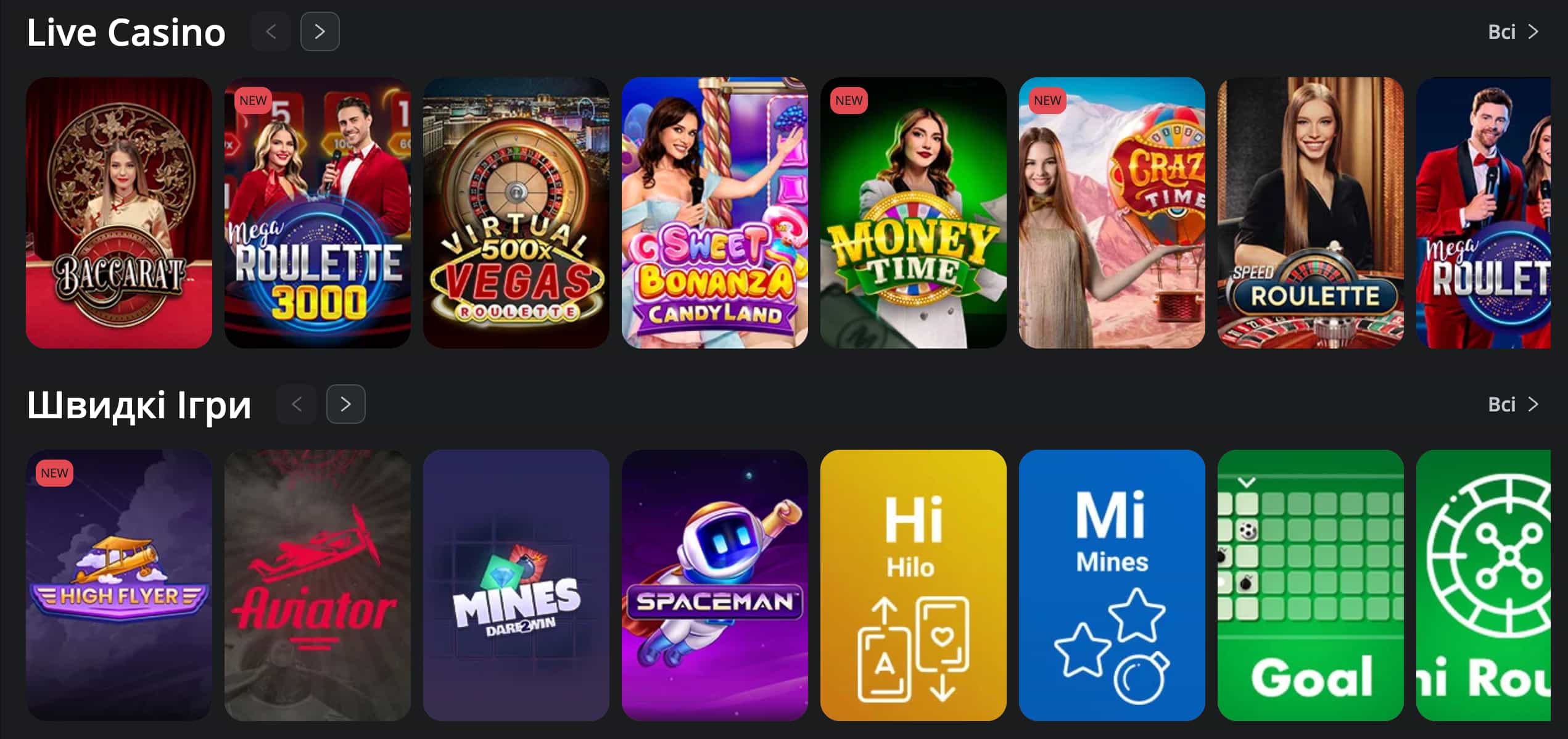 Для нових користувачів доступна стартова пропозиція — фріспіни або бонус на депозит. Формат залежить від поточної акції: це може бути множник до першого депозиту або певна кількість безкоштовних обертань у слотах.