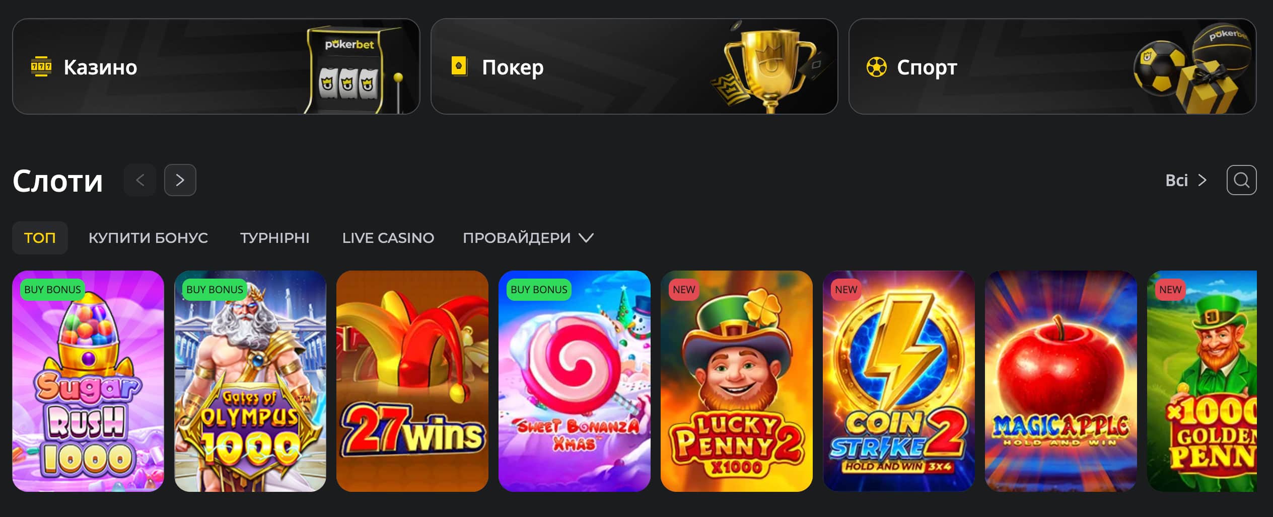 Pokerbet — це не лише покер. Платформа має повноцінне онлайн казино Pokerbet Casino, де представлені сотні слотів з бонусами, настільні ігри та розділ лайв-казино Pokerbet з реальними дилерами.